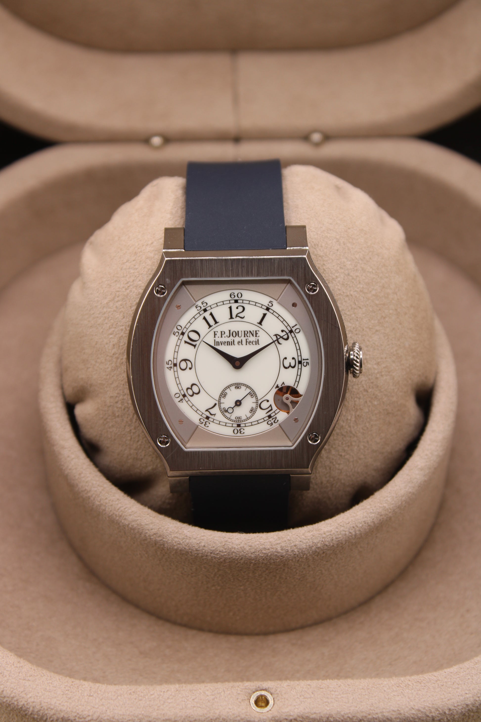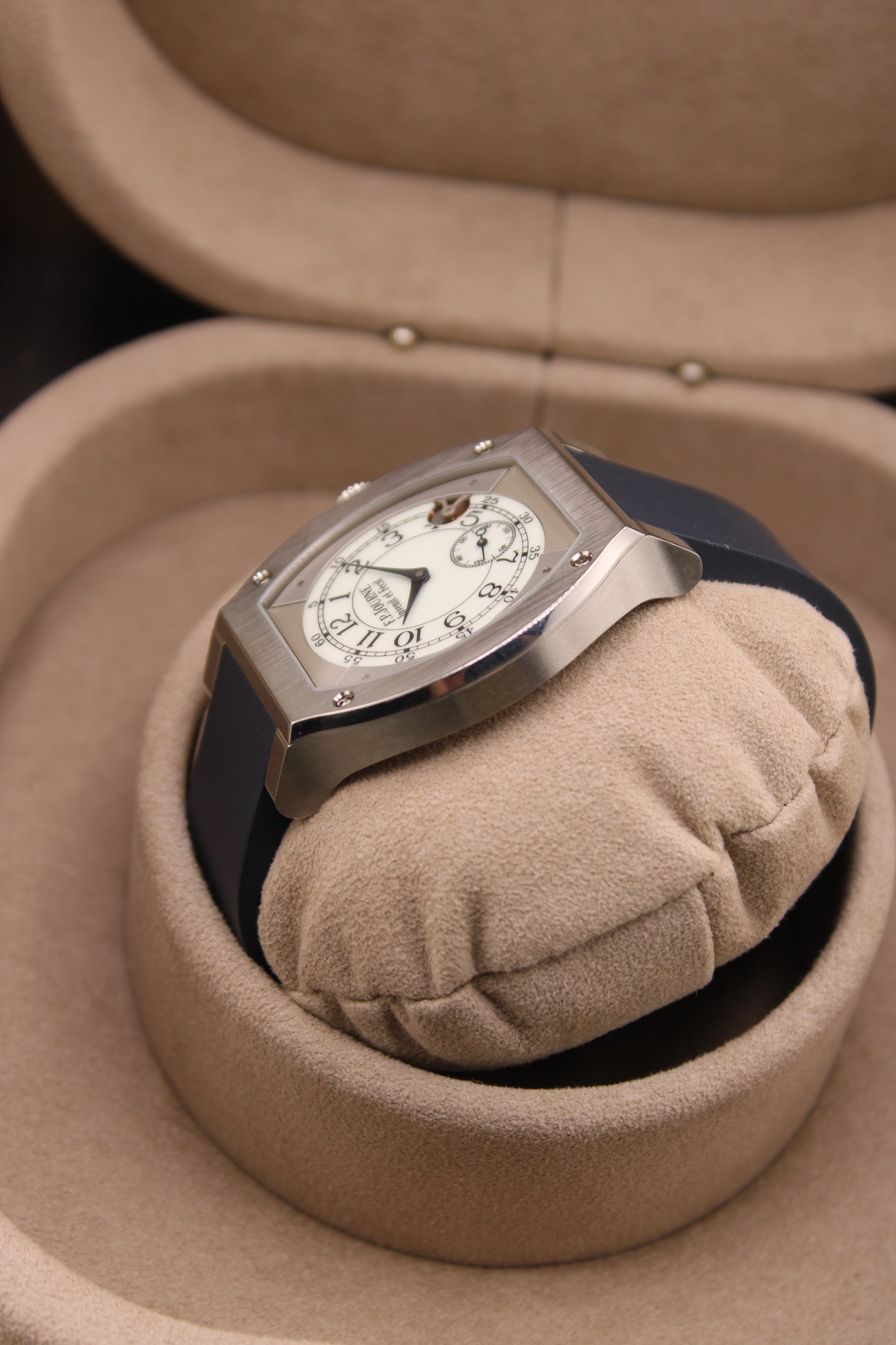 Experience timeless sophistication with this F.P. Journe Élégante 48, featuring the elegant white dial and signature blue rubber strap. A true blend of mechanical artistry and modern innovation, this piece perfectly embodies François-Paul Journe’s philosophy of “Invenit et Fecit” — He invented it and made it.