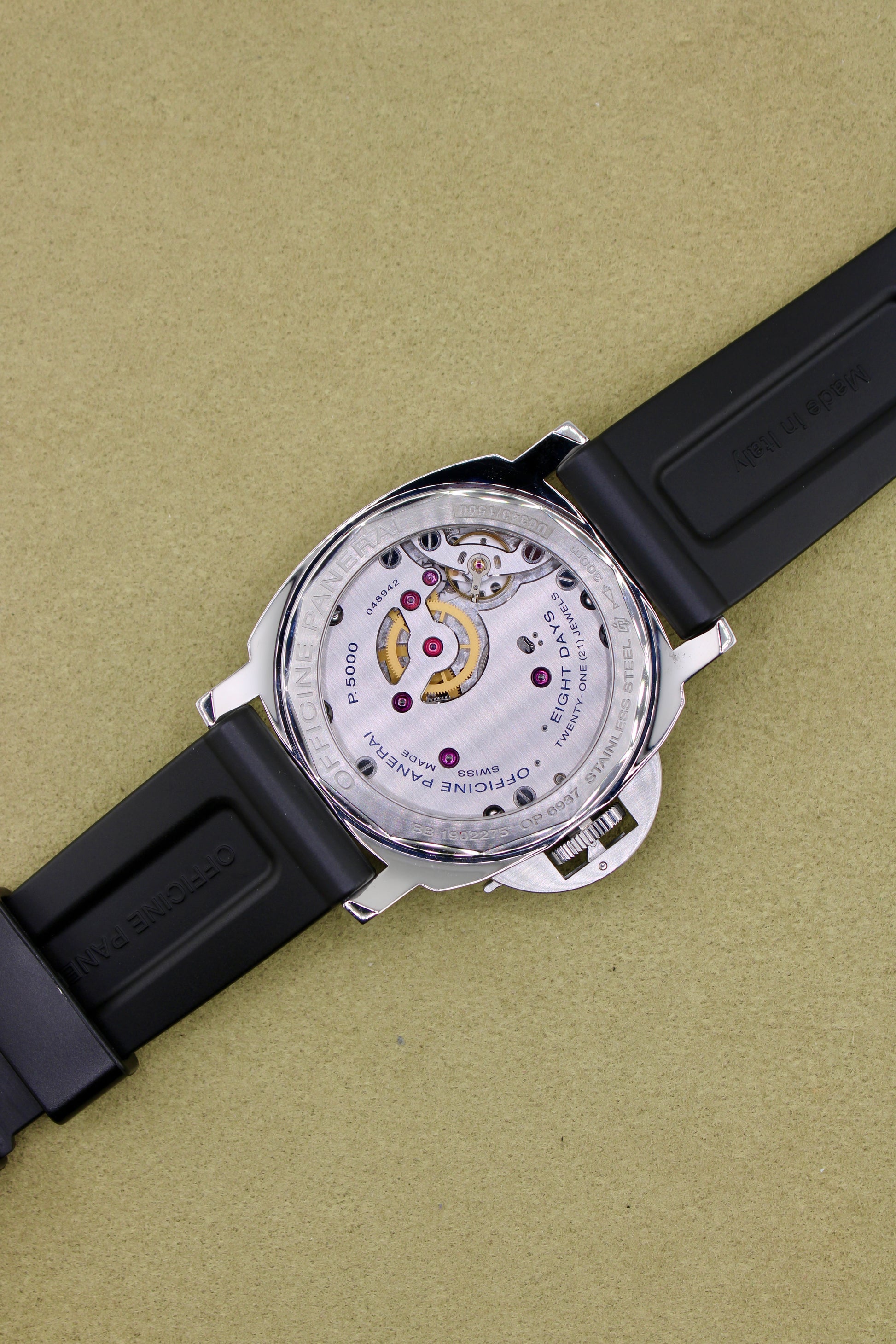 Powered by Panerai’s in-house 8-day manual-wind movement, the watch delivers exceptional power reserve and mechanical presence on the wrist.
